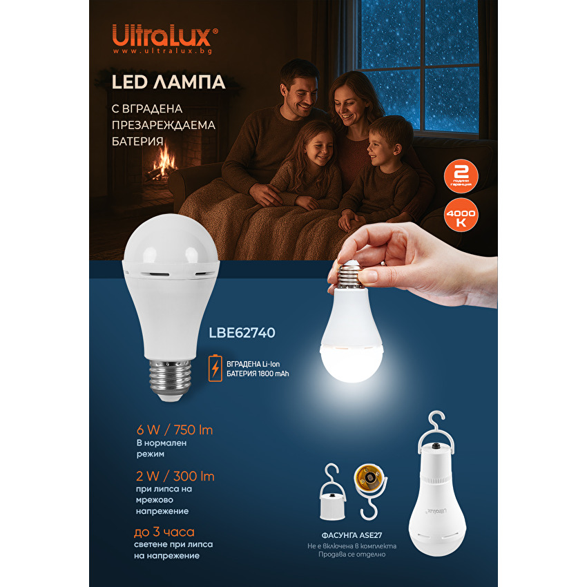 Нов модел LED крушка с вградена батерия, с мощност 6W в нормален режим и 2W при липса на мрежово напрежение. Вградената батерия обезпечава до 3 часа светене при липса на захранващо напрежение.