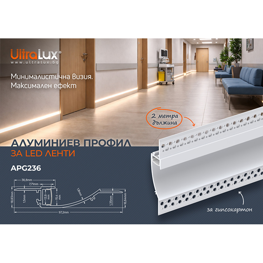 APG236 е сив алуминиев профил за гипсокартон с дължина 2 метра. Той е предназначен за монтаж между два листа гипсокартон като светеща ивица (фуга). При монтаж е необходимо профилът да се захване чрез крепежни елементи за конструкцията. За профилът се предлагат комплект крайни тапи APG236KT. Дифузерът на профила е с бял цвят, който редуцира част от излъчената светлина.