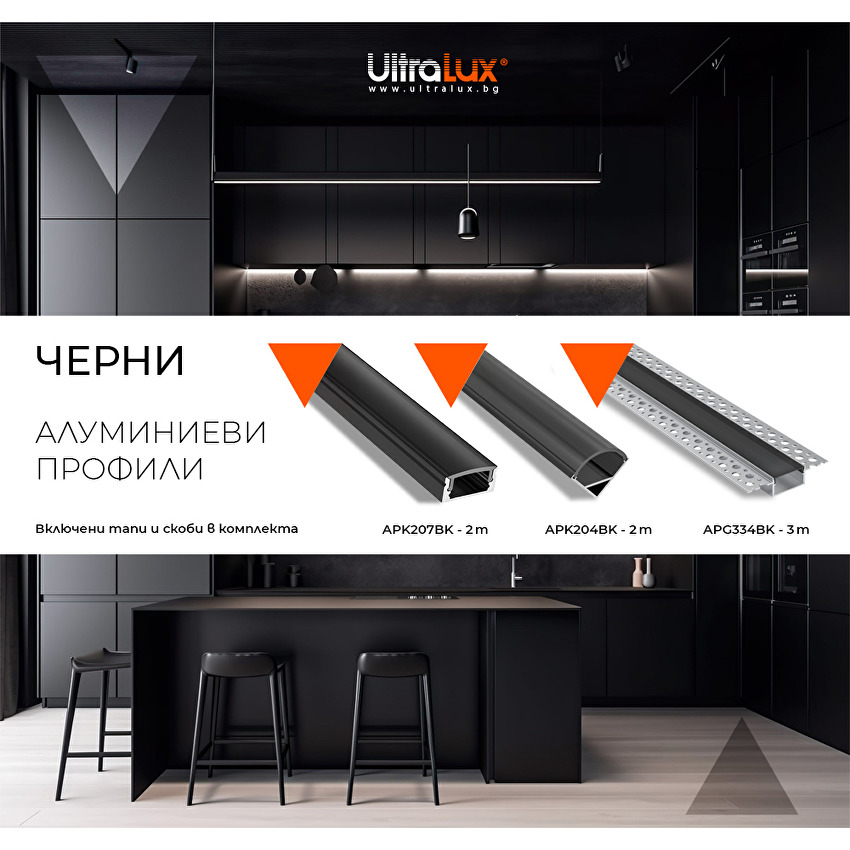 Алуминиевият профил е предназначен за вграждане в гипсокартон, като след монтажа видим остава единствено неговият черен дифузер. Геометрията му позволява използването на абсолютно всички видове LED ленти UltraLux.