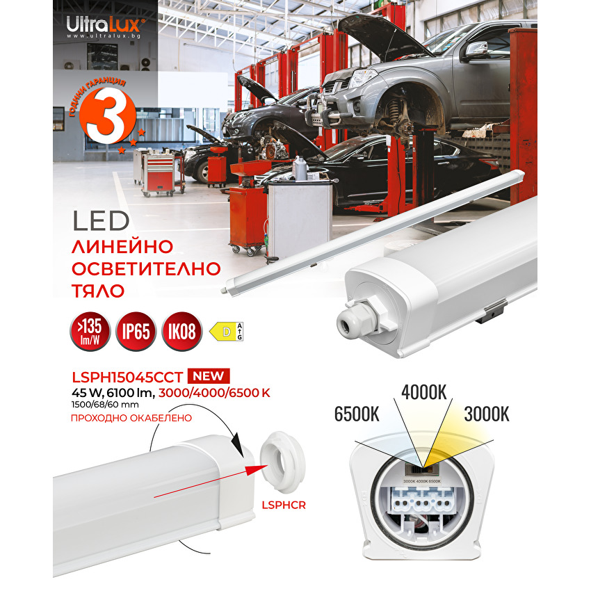 - Възможност за избор на типа светлина 3000K/4000K/6500K, чрез превключвател, разположен над клемореда;