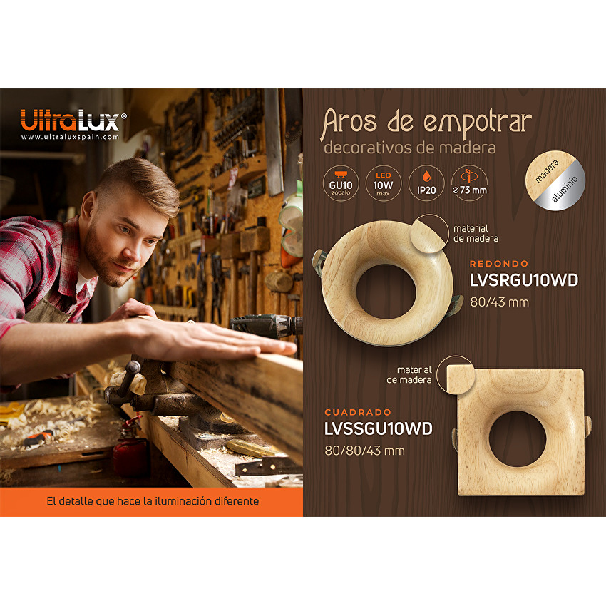 Dos modelos de aros fijos empotrables para dicroicas de  LED, los cuales están disponibles en dos formas: redonda y cuadrada. Su característica distintiva es que la parte decorativa del producto está fabricada íntegramente en madera, lo que complementa cualquier solución de iluminación interior. Los productos están diseñados para fuentes de luz LED con una potencia máxima de 10 W. Según la aplicación, pueden utilizarse dicroicas de 220 V, ya que el conjunto incluye un portalámparas GU10, o bien pequeños módulos LED. Los aros  cuentan con una abertura de montaje estándar, lo que garantiza una instalación rápida y sencilla, así como la sustitución de aro ya existentes.