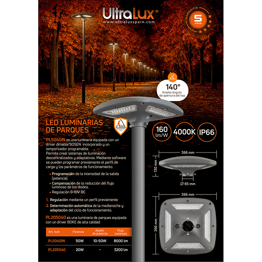La luminaria combina diseño elegante, fiabilidad y una iluminación eficiente en cualquier entorno exterior. Con una eficiencia de 160 lm/W y un ángulo de apertura de 140°, garantiza una luz intensa y uniforme, ideal para parques, senderos, espacios públicos y zonas residenciales. Los módulos LED integrados ofrecen una larga vida útil y alta eficiencia energética, lo que reduce significativamente los costes de mantenimiento. La estructura resistente, diseñada para soportar condiciones exteriores, cuenta con protección mecánica IK08. El modelo incorpora protección contra sobretensiones de 6 kV, lo que lo hace fiable incluso en condiciones atmosféricas adversas. Su diseño estilizado y compacto se integra perfectamente en el entorno urbano, convirtiéndolo en una solución ideal para iluminación exterior moderna y económica.